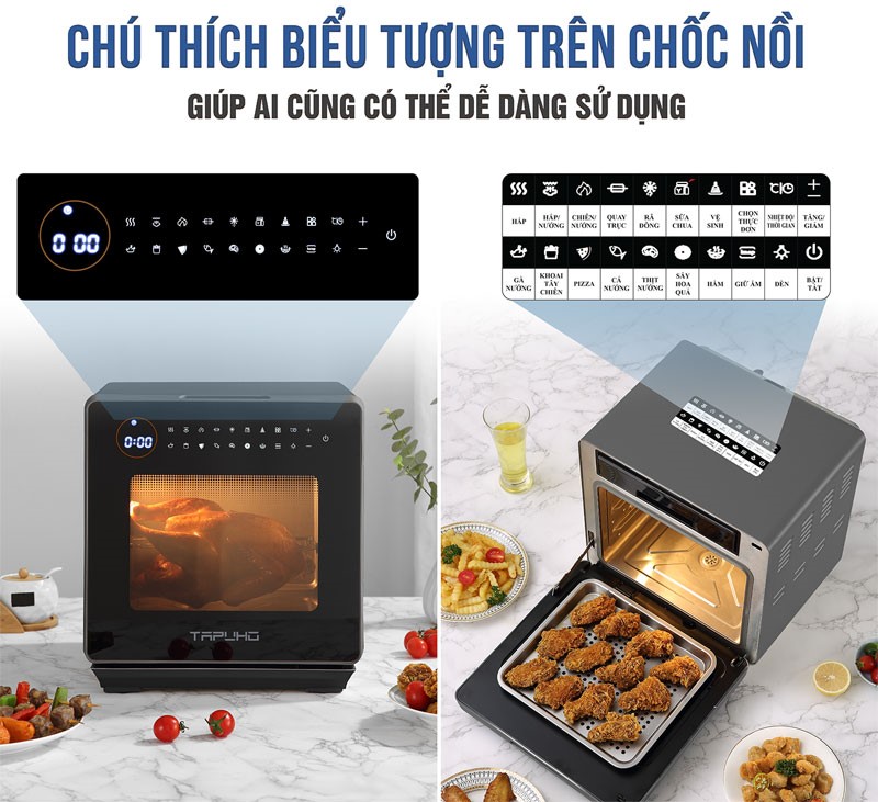 - Tapuho TSF16 sở hữu công nghệ chiên nướng không dầu Rapid Air kết hợp với quạt đối lưu 360 độ sẽ giúp cho món ăn chín đều và nhanh chóng hơn.