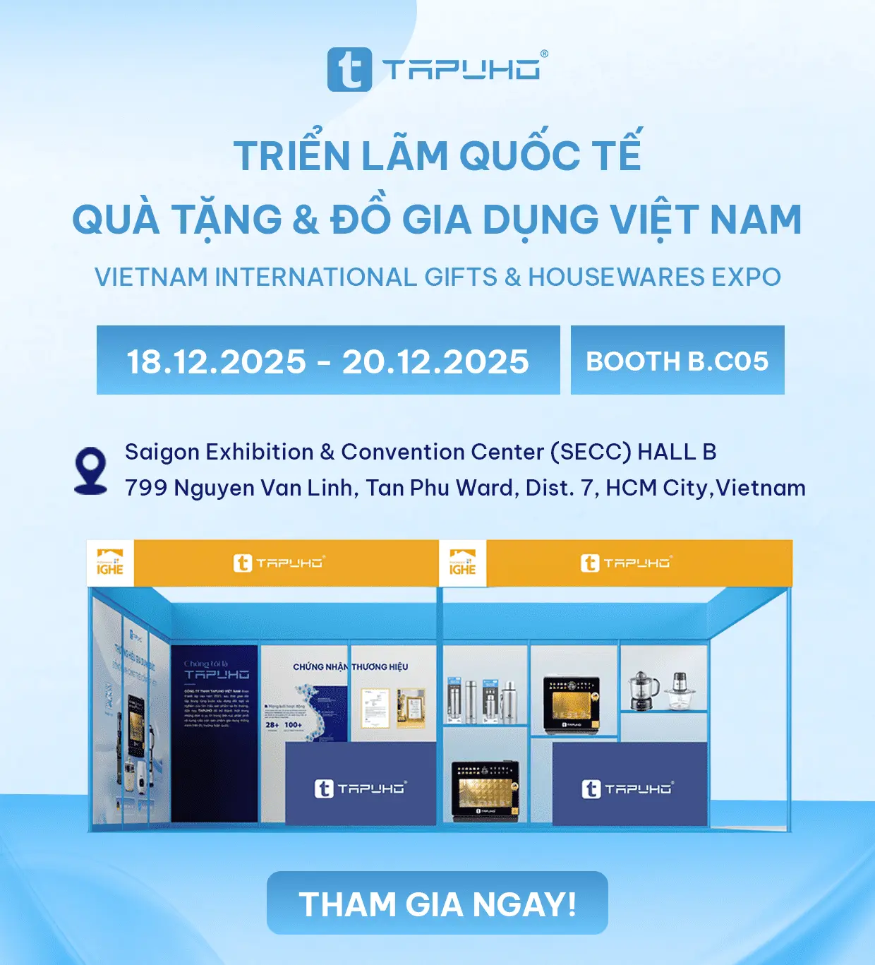 Từ ngày 18–20/12/2025, TAPUHO chính thức tham gia Vietnam International Gifts & Housewares Expo 2025 (IGHE 2025) – triển lãm quốc tế uy tín trong lĩnh vực đồ gia dụng, quà tặng và giải pháp sống hiện đại, diễn ra tại SECC – Saigon Exhibition & Convention Center, TP.HCM.